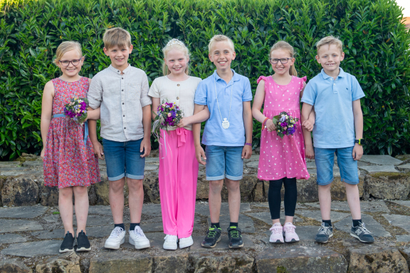 Kinderkönig Kalle Krösche und Kinderkönigin Thea Westing mit ihrem Hofstaat; Mattis Tegeder und Leoni Buschermöhle, Emil Oertlinger und Adele Schlüter